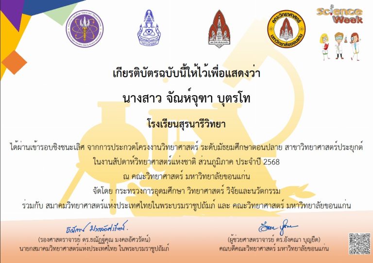 การแข่งขันได้ผ่านเข้ารอบชิงชนะเลิศ จากการประกวดโครงงานวิทยาศาสตร์ ระดับมัธยมศึกษาตอนปลาย สาขาวิทยาศาสตร์ประยุกต์ คณะวิทยาศาสตร์ มหาวิทยาลัยขอนแก่น ปี 2568
