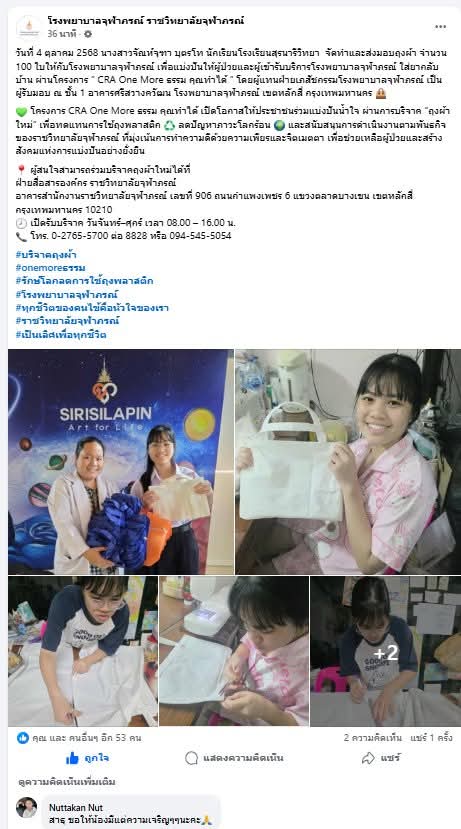 กิจกรรมจิตอาสาจัดทำและส่งมอบถุงผ้า จำนวน 100 ใบให้กับโรงพยาบาลจุฬาภรณ์ เพื่อแบ่งปันให้ผู้ป่วยและผู้เข้ารับบริการโรงพยาบาลจุฬาภรณ์ ใส่ยากลับบ้าน ผ่านโครงการ CRA One More ธรรม คุณทำได้ 4 ตุลาคม 2568