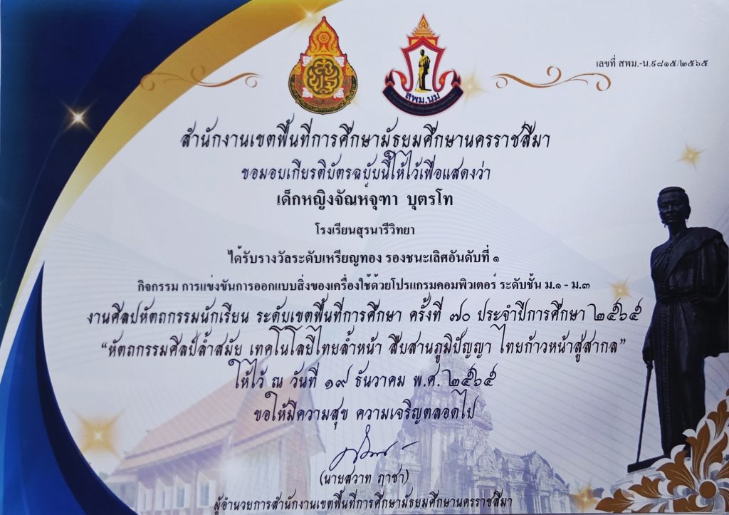 รางวัลระดับเหรียญทอง รองชนะเลิศอันดับที่ 1 การแข่งขันออกแบบสิ่งของเครื่องใช้ด้วยโปรแกรมคอมพิวเตอร์ ระดับชั้น ม.1-ม.3 ปี 2565