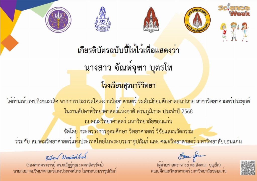 ได้ผ่านเข้ารอบชิงชนะเลิศ จากการประกวดโครงงานวิทยาศาสตร์ ระดับมัธยมศึกษาตอนปลาย สาขาวิทยาศาสตร์ประยุกต์ คณะวิทยาศาสตร์ มหาวิทยาลัยขอนแก่น ปี 2568
